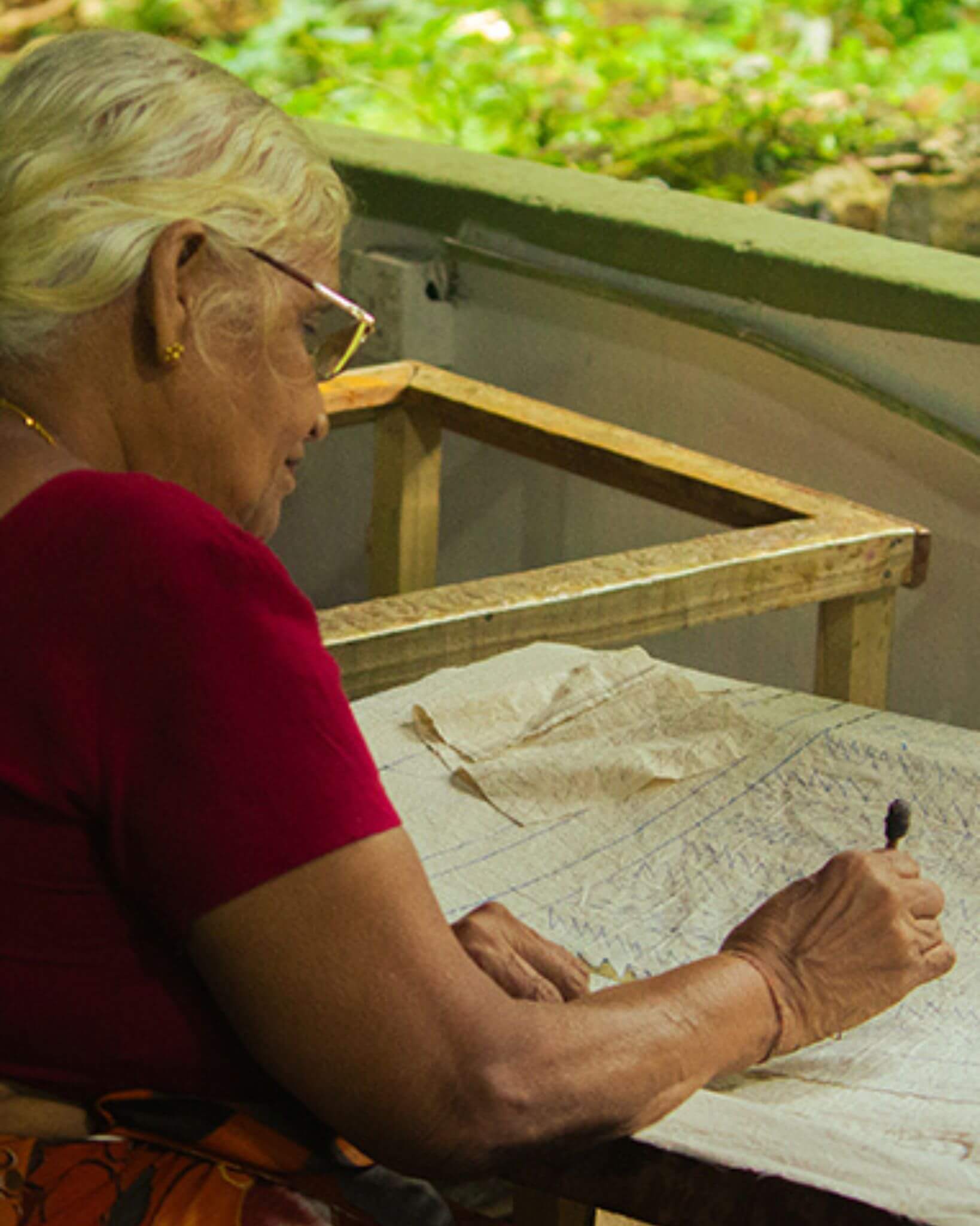 At Aluwihare Centre, some of the original artisans have worked there for sixty years. That’s an entire lifetime with the loom, batik, or embroidery; tracing, waxing, dyeing, tailoring, finishing, needlework, painting, waxing paper, assembling floral elements. Often, such a body of knowledge accumulated over a lifetime, is nearly impossible to get documented. Such knowledge can only be transmitted through close apprenticeship or years of collaboration.