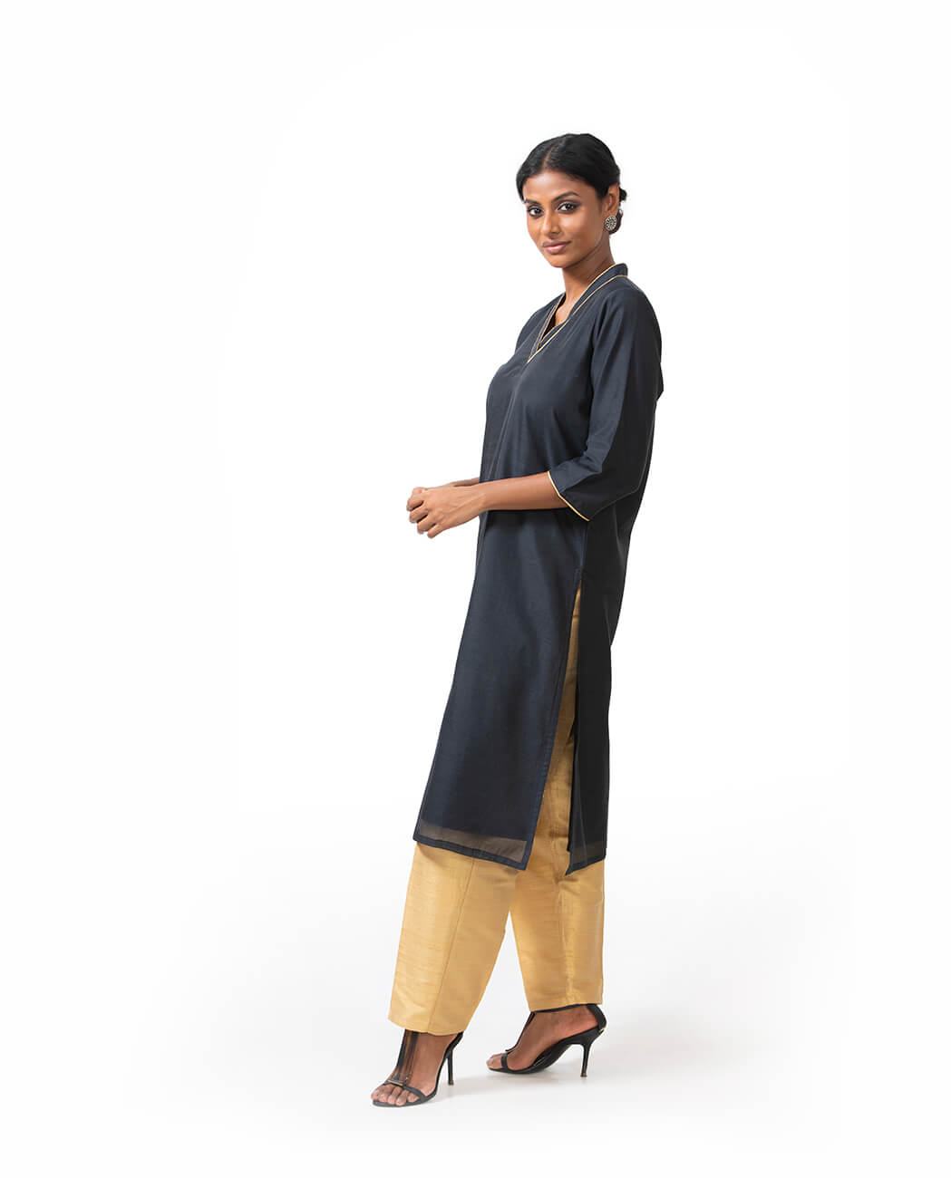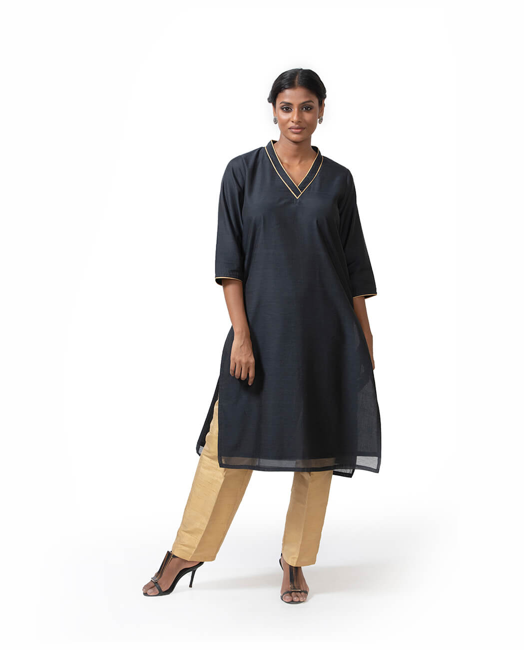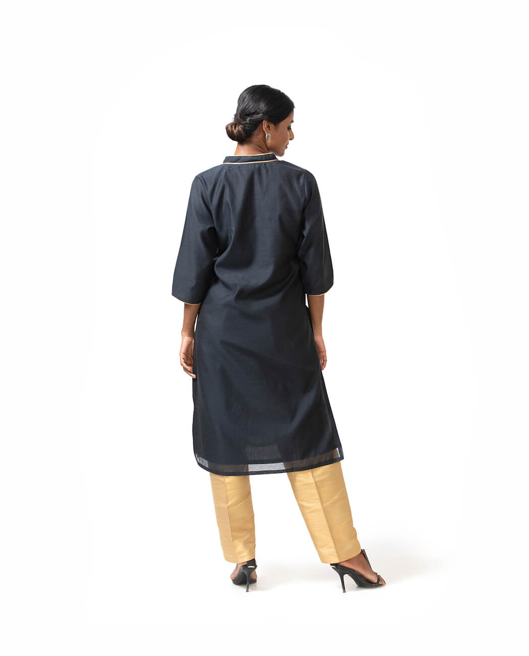 The Benaras Black Silk-Cotton Kurta, handwoven by local artisans, is a sensible addition to your wardrobe in that it hardly fails to have the desired effect, which is to convey a surety in class ingrained and elegance displayed. Subtly decorated around the V-shaped neckline and sleeves with gold trim, the kurta looks just gorgeous when paired with light-toned raw silk pants.