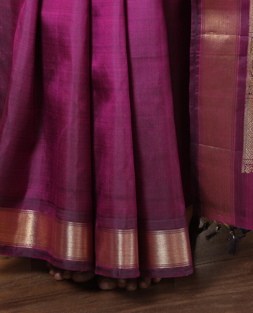 Traditional Kanchipuram Sarees are handwoven to achieve a singular sense of quality and worn beauty. The breathtaking design infuses the vestiges of royalty through a wash of solid royal purple, the stunning simplicity of which is supplemented by a complexly woven extra-long gold pallu and borders of finely fashioned peacocks. Celebrations of grand scale are highly deserving of a presence adorned in a saree such as this.