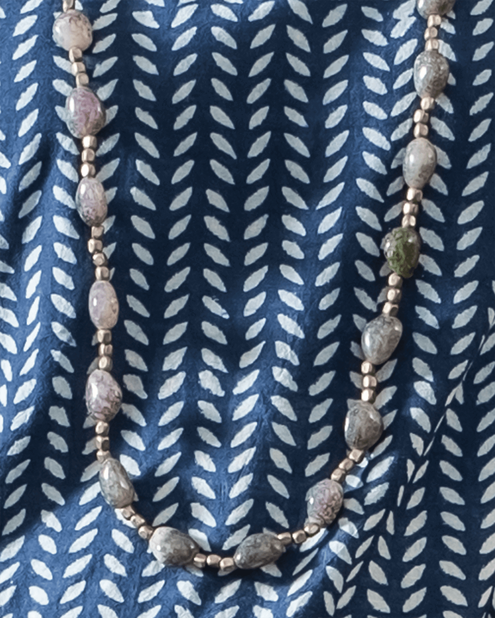 The beads in this chain are of a grey-green colour, while the square beads are made of brass. The brass beads are spaced out along the chain, adding visual interest and texture to the piece.
