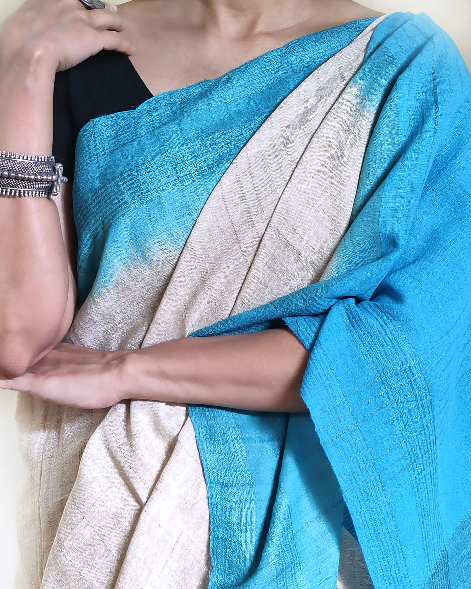 The smooth ridges of this exquisitely textured Tussar Silk Sari embody simple elegant sophistication; yet the warmest of days can be embraced with comfort and ease. Opaline ivory gives way to a sea of turquoise like a mirror held up to the sacred River Ganges that kisses the shores of breathtaking Bihar before continuing on its enduring, soulful journey.
