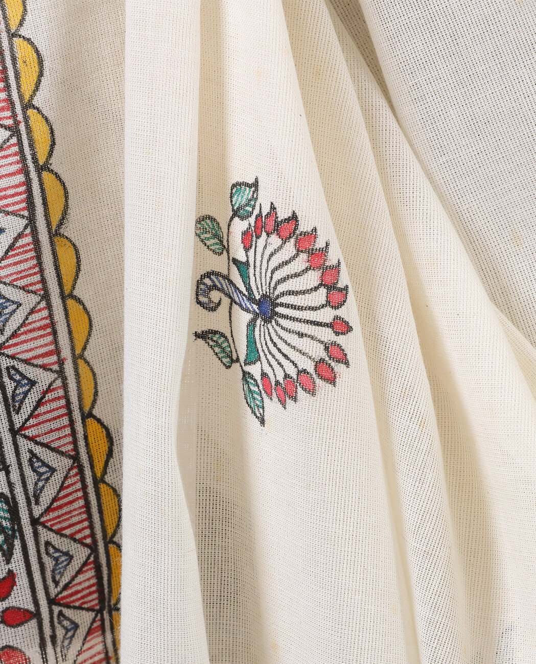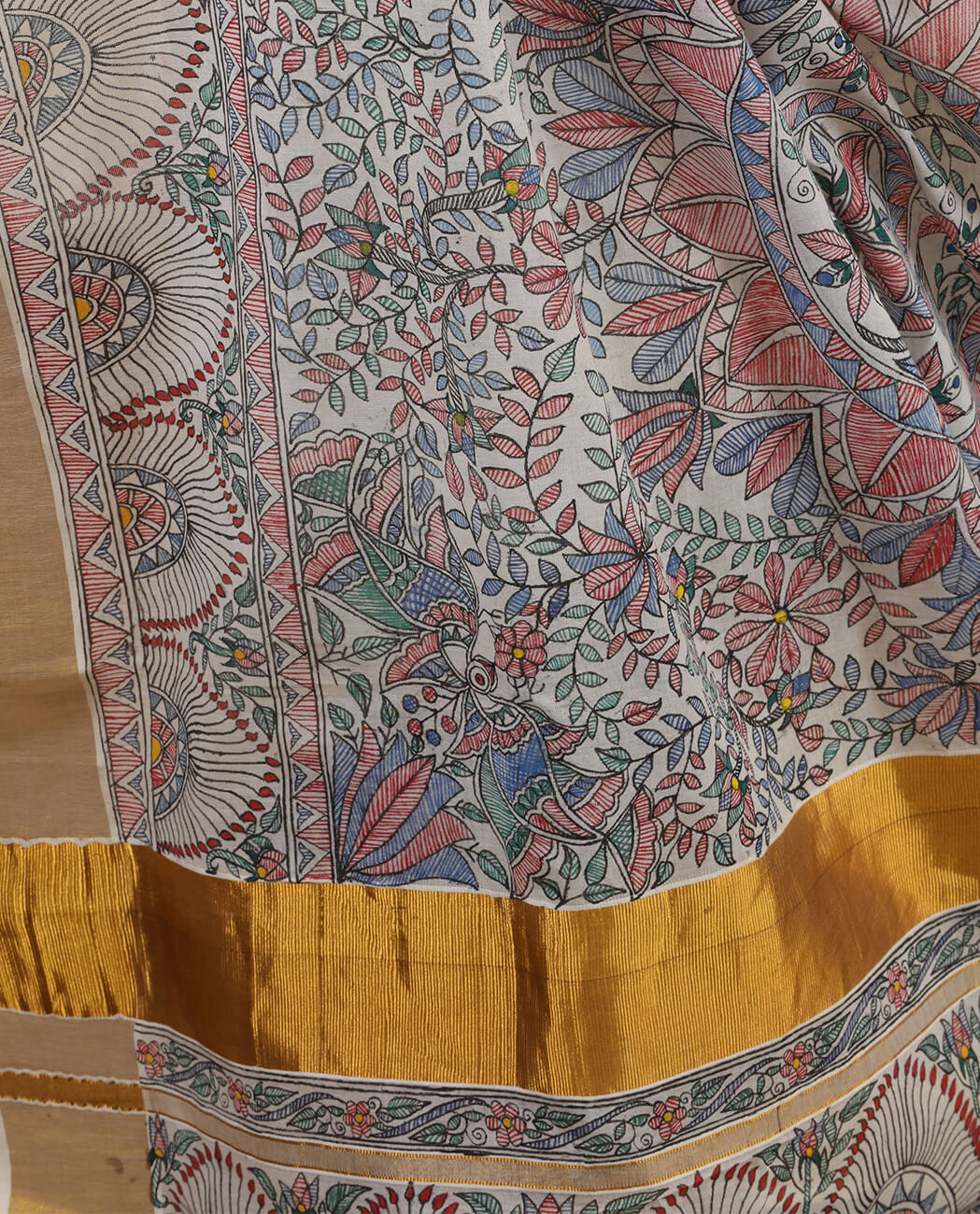 The form of folk art known as Madubhani, originating from the Mithila region in the Northern Bihar state, is the dominating aesthetic of this beautiful cotton saree. The gold, silver and metallic patterns have been painted on the off-white body using fingers, twigs, pens and nib brushes in expressing different aspects of nature and local culture. The gold border and pallu serve their purpose of imbuing a hint of rich heritage as is typical of Madubhani styling. Best suited for the day and much more if the event demands a certain conveyance of spirituality and sensitivity to culture.