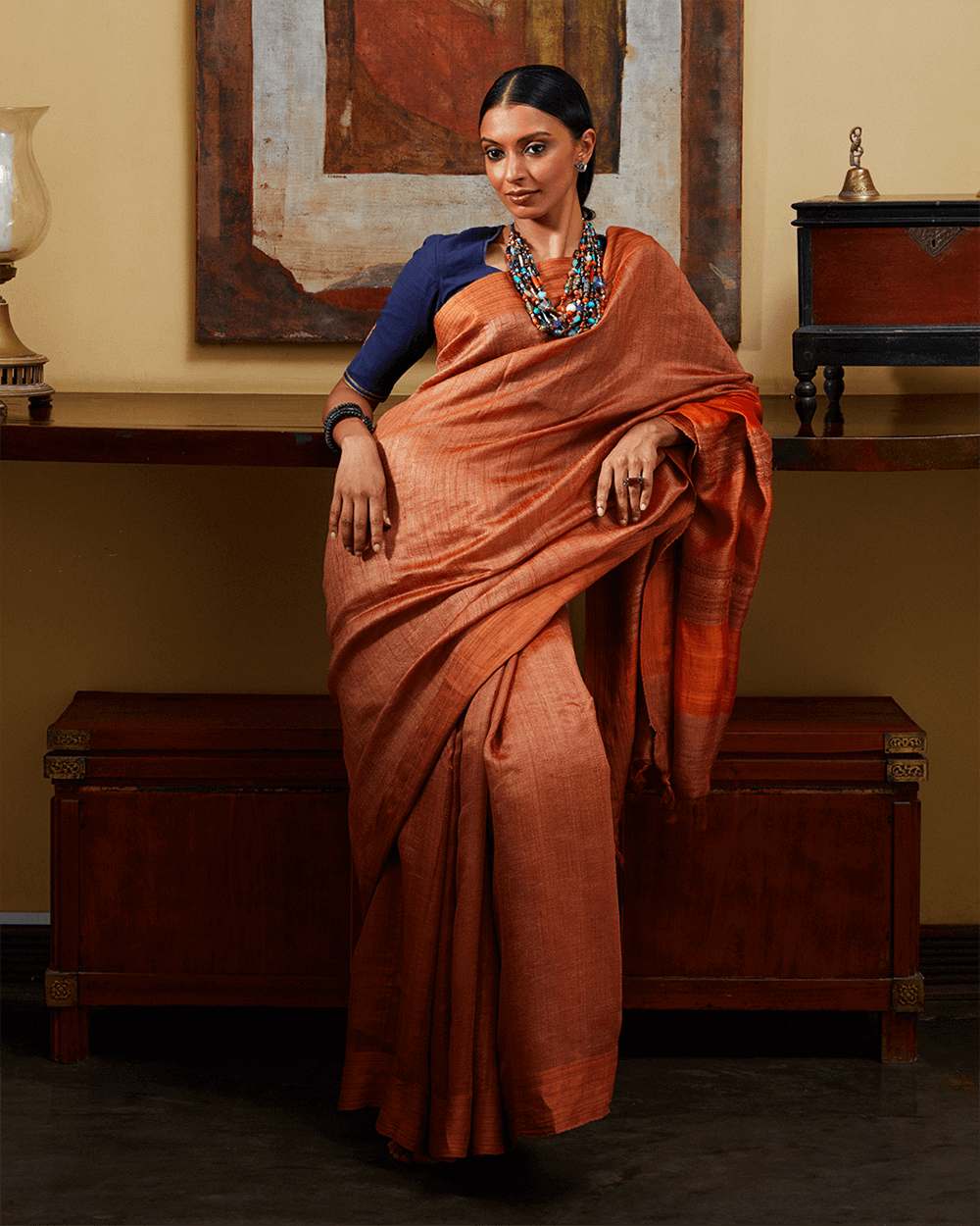 The rich coppery hue of this Tussar silk sari evokes an allure of ancient temples and grand palaces, teasing the imagination with a treasure trove of shimmering secrets waiting to be discovered.