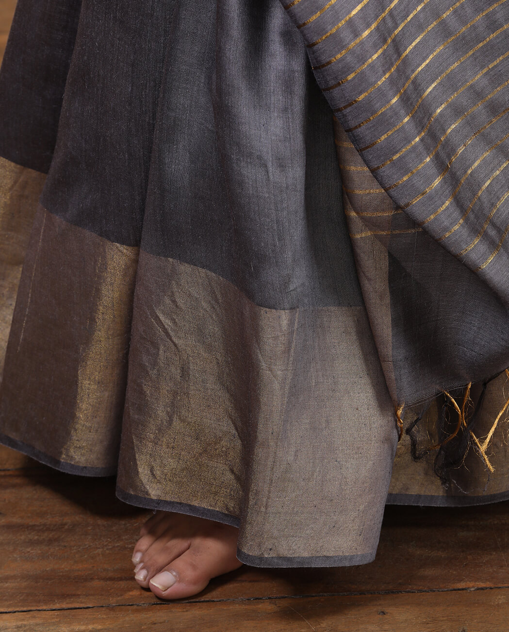 The shimmering Desi Tussar Silk fabric with its smoky grape hue brings to mind the sky approaching the oncoming night, where the last remaining traces of light give off an unearthly glow. When paired with a brightly coloured blouse of ornate detail, the complete outfit will strive and succeed in placing you in a clever state of stylistic balance between being vibrant and subdued.