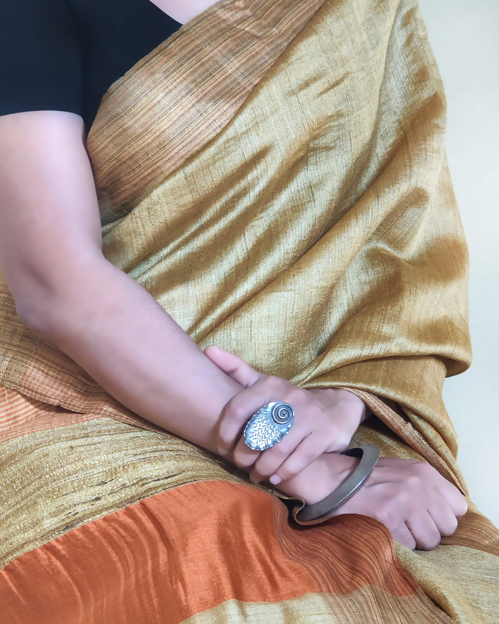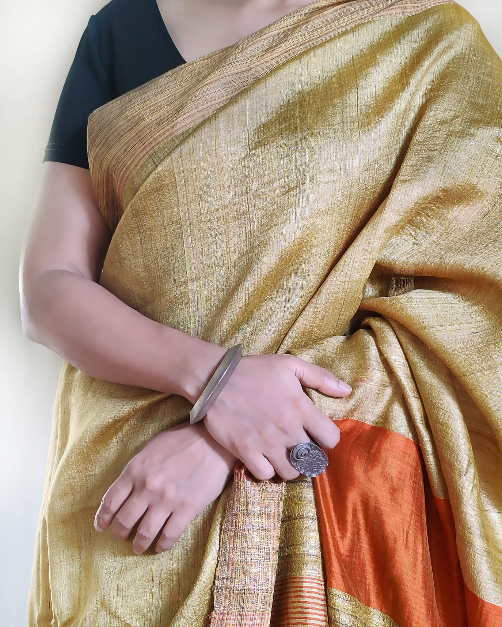 Dull gold mustard tussar with a contrast rust orange pallu. Tussar silk is more textured than the mulberry silk but still maintains a rich appearance.