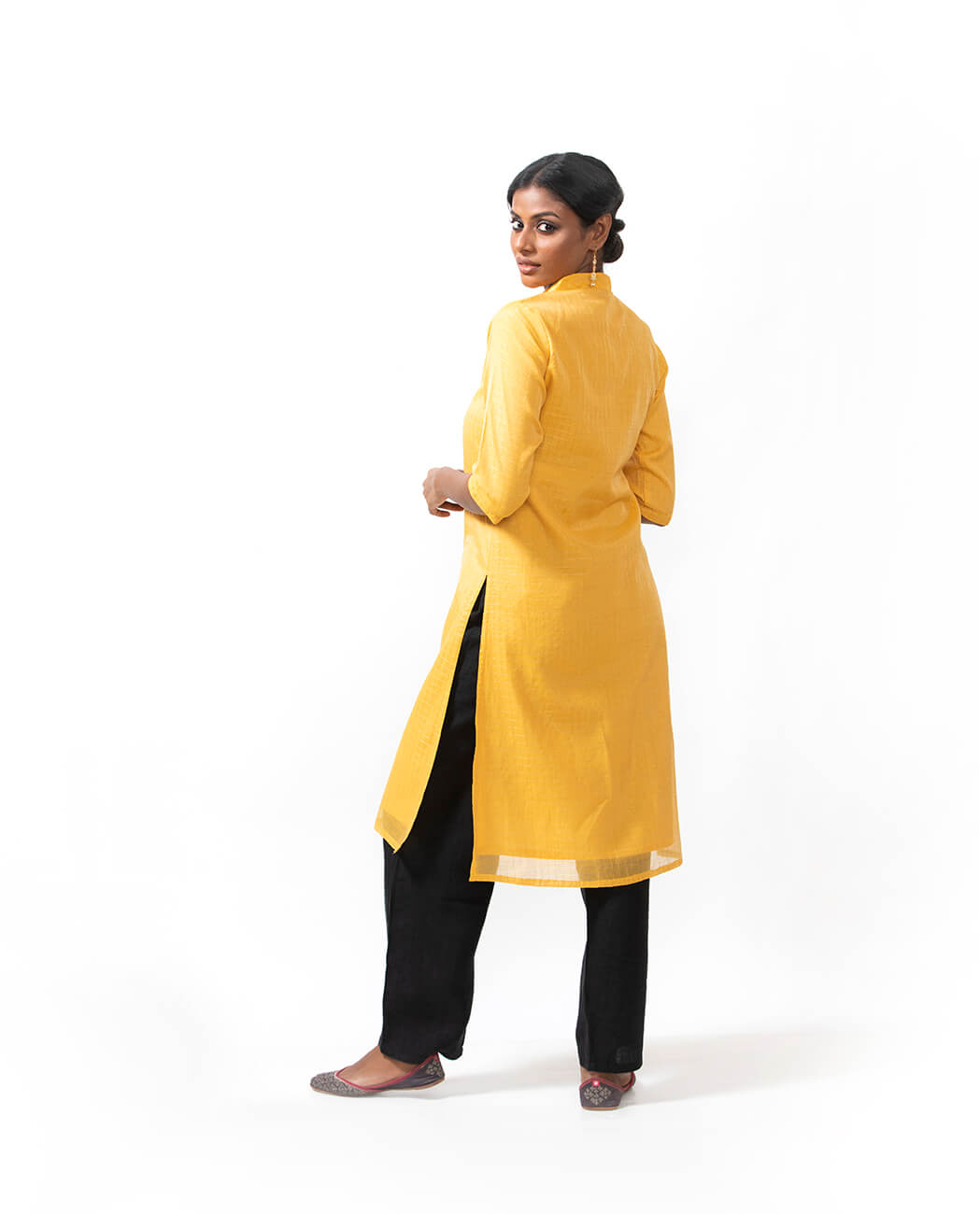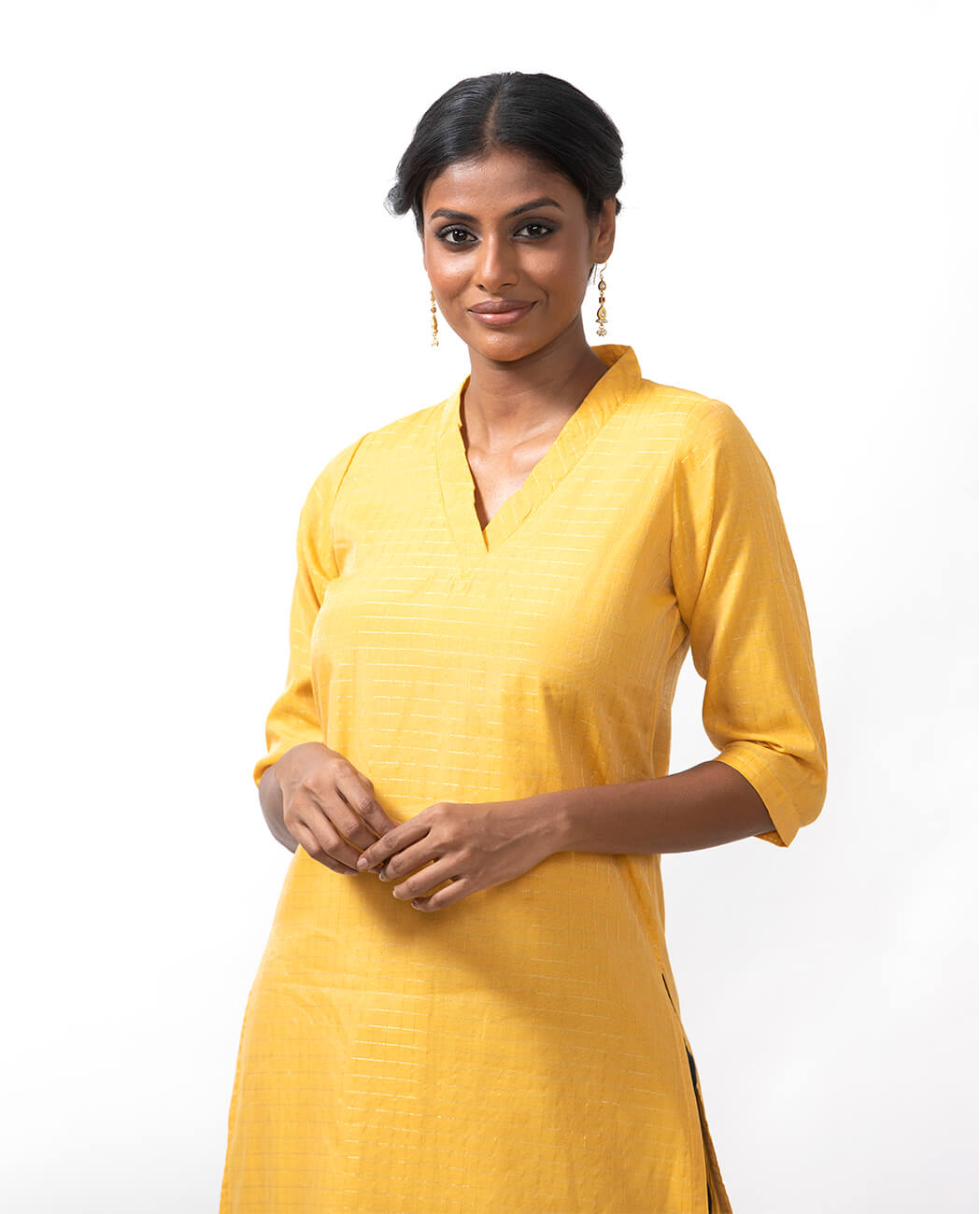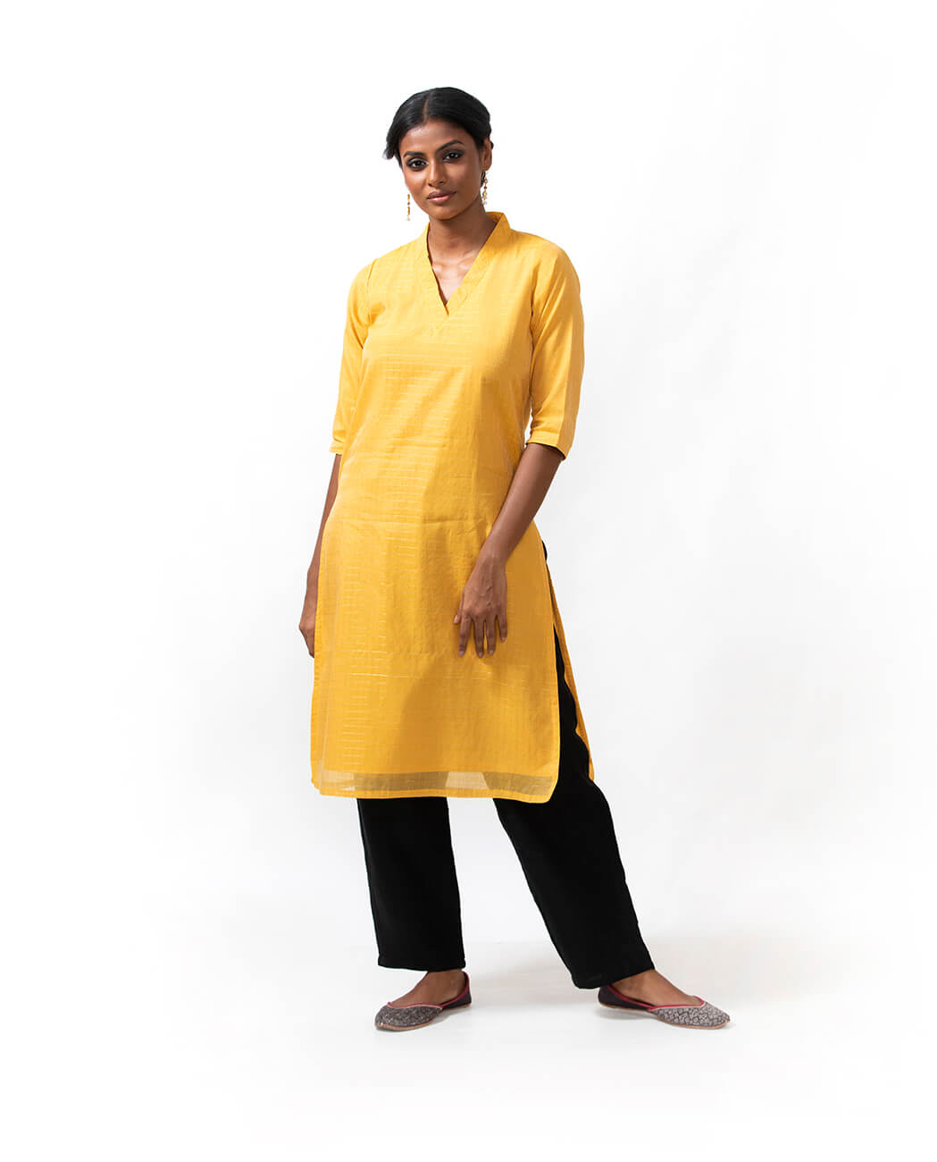 A festive Suruti Kurta made by local artisans using handwoven Benaras silk-cotton fabric. Look positively glowing in sunflower yellow with tiny checks of gold all over, as well as intricate gold trims on the elegantly cut V-neck and sleeves. Ideally paired with black Fulia linen pants and Benaras brocade dupatta.